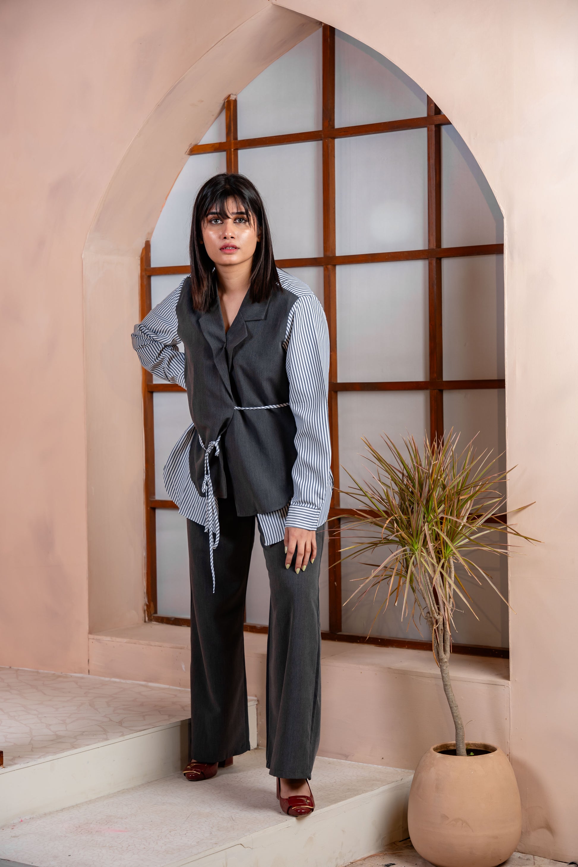 A modern grey co-ord set paired with striped sleeves for a structured, contemporary look, sleek, versatile, and effortlessly chic.