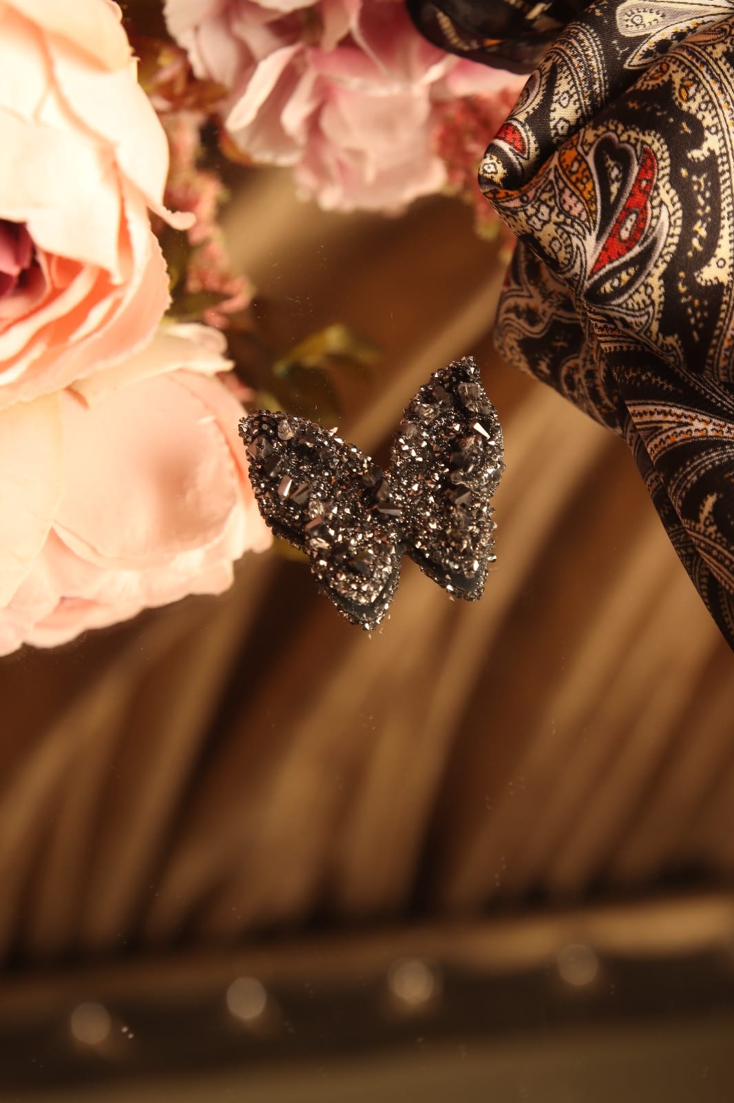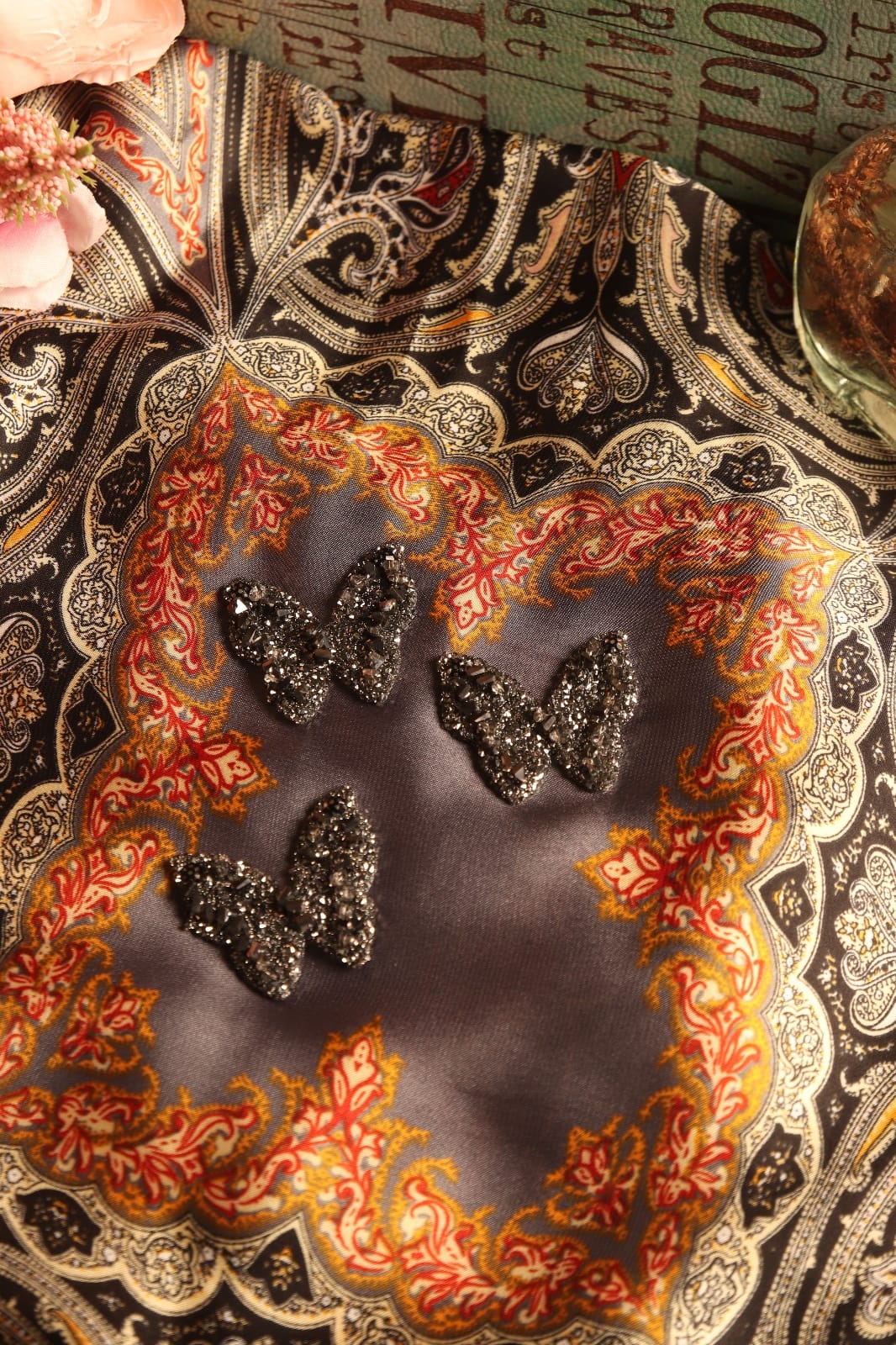 The "Midnight Flutter" hotfix motif captures the delicate elegance of a butterfly in a shimmering dark crystal design. Symbolizing transformation, resilience, and beauty, this motif adds a touch of mystique and glamour to any fabric or accessory. Whether adorning evening wear, scarves, or statement pieces, "Midnight Flutter" embodies the grace and charm of a butterfly taking flight under the moonlight.