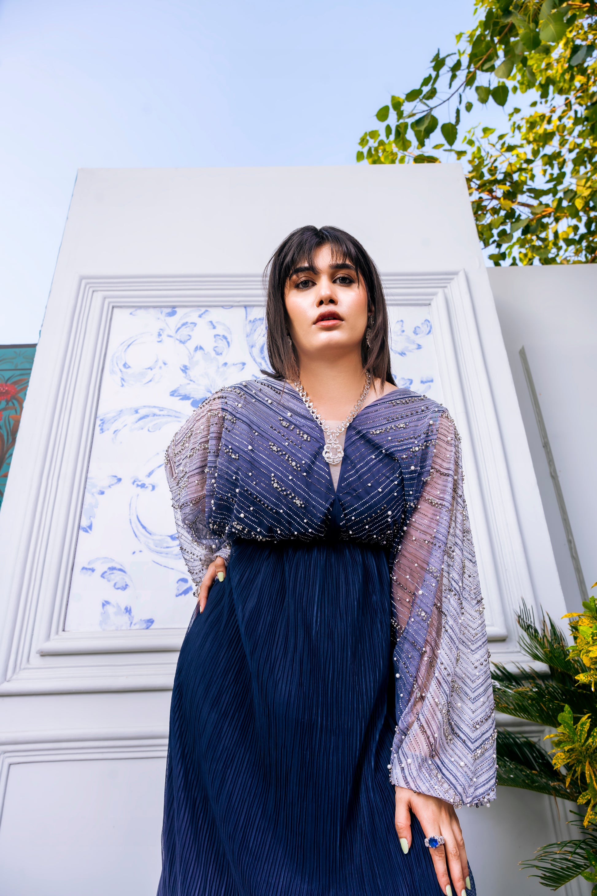A semi-formal long dress crafted to radiate grace and poise. Azure Elegance features a flowing silhouette and refined detailing, designed to flatter effortlessly while maintaining a contemporary charm. Its serene blue hue adds depth and sophistication, making it perfect for evening events or special gatherings where style meets subtle luxury.