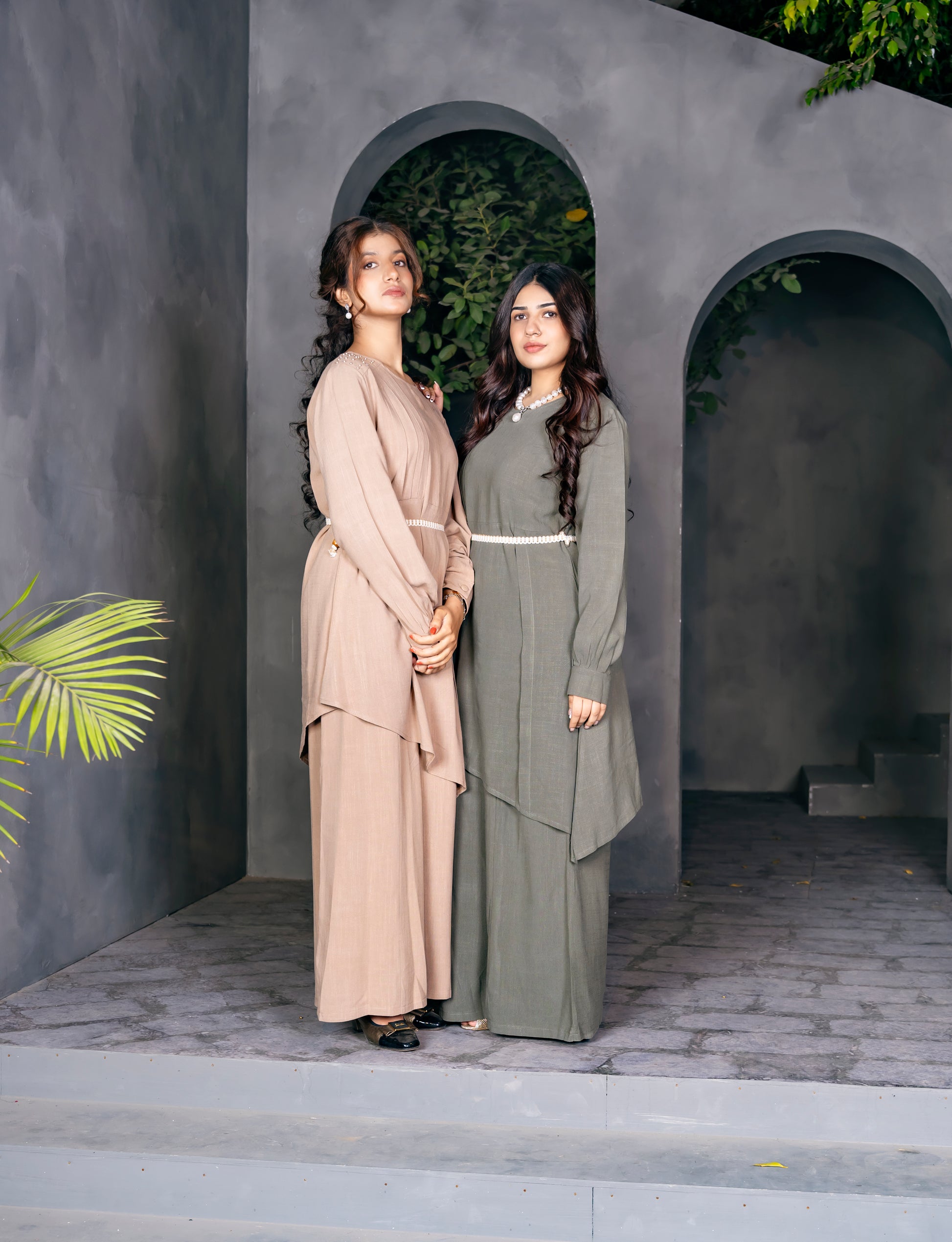 Earth-toned elegance meets architectural minimalism in this layered ensemble, defined by belted silhouettes and grounded styling against a sculptural backdrop. …